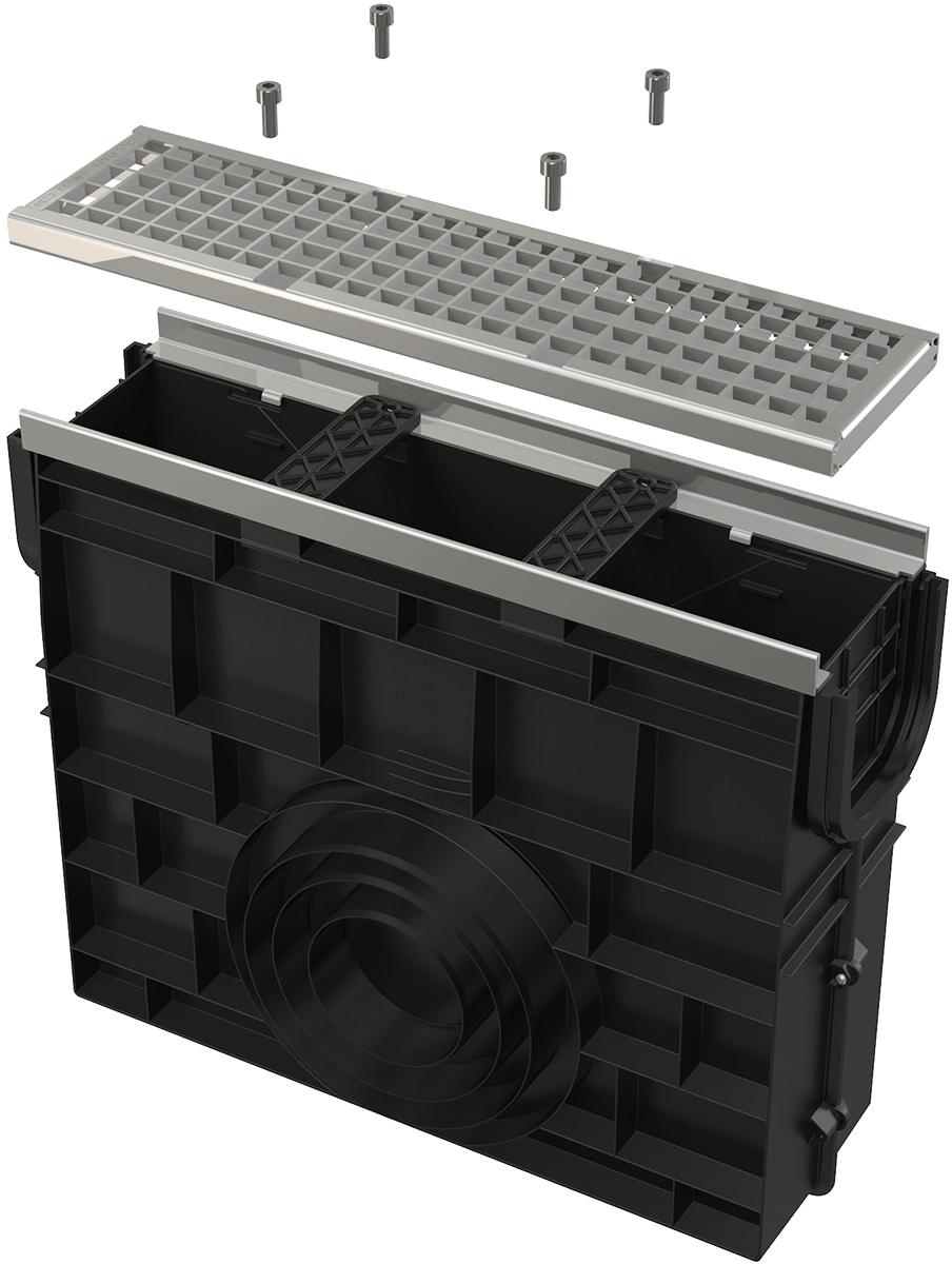 - Cast iron grid – fixed to the drain with four pcs of stainless steel screws, inlet slit width 12.5 mm