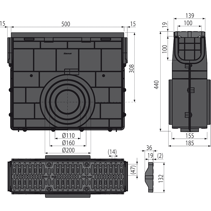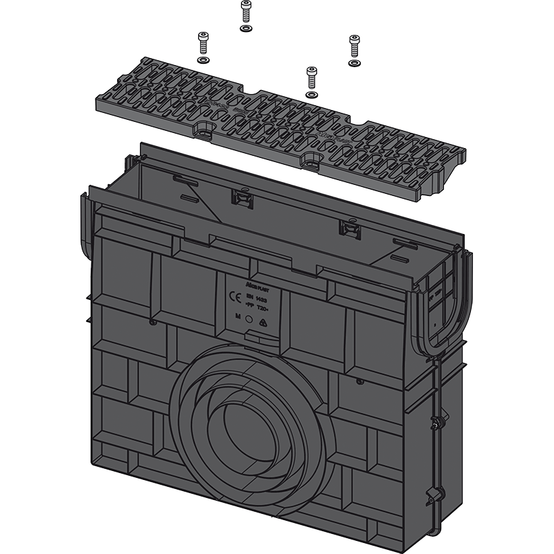 - Composite grid – fixed to the drain with four stainless steel screws, inlet slit width 14 mm