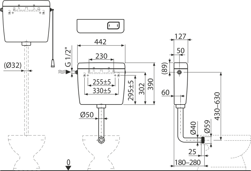 • Flush set for the high-lying cistern (cord, handle, lever)