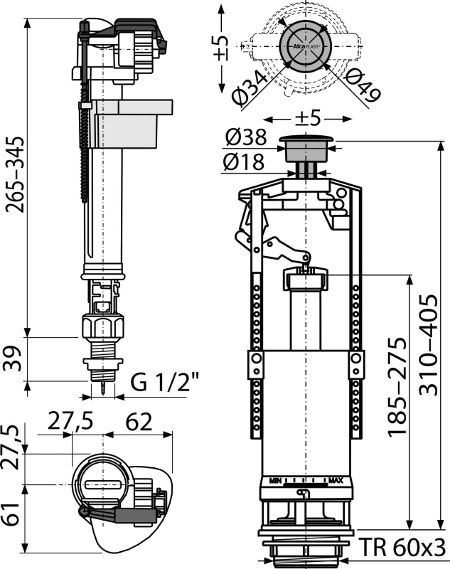 • The design allows optimum height adjustment of the valve according to the height of the cistern