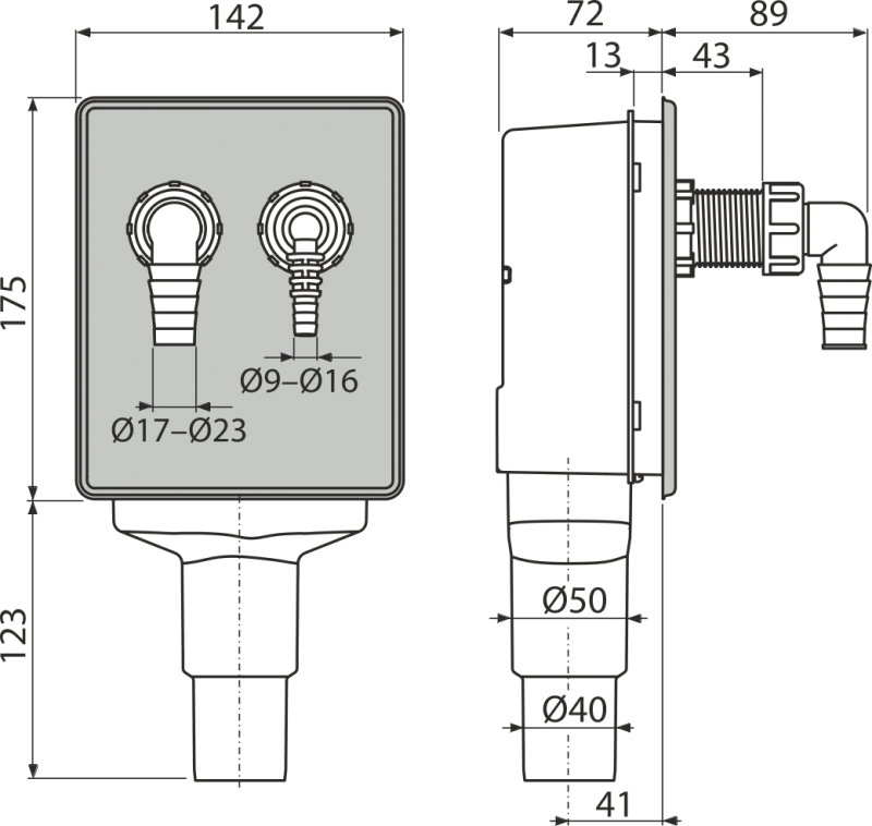 Concealed washing machine trap for connecting two appliances, stainless steel DN40 and DN50