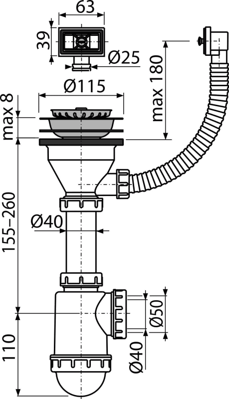 Sink waste and trap with stainless steel grid DN115 and flexi overflow