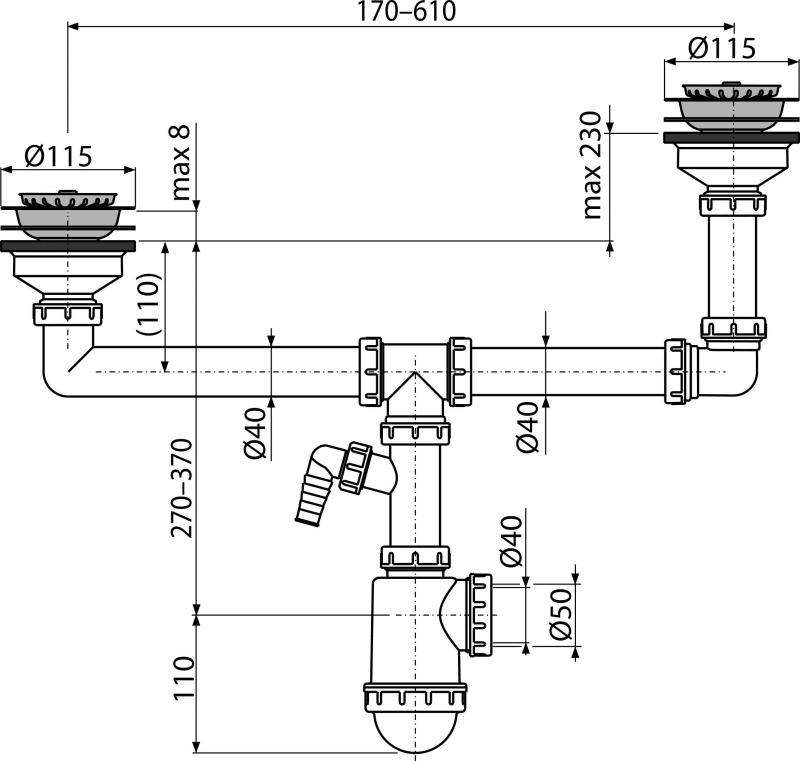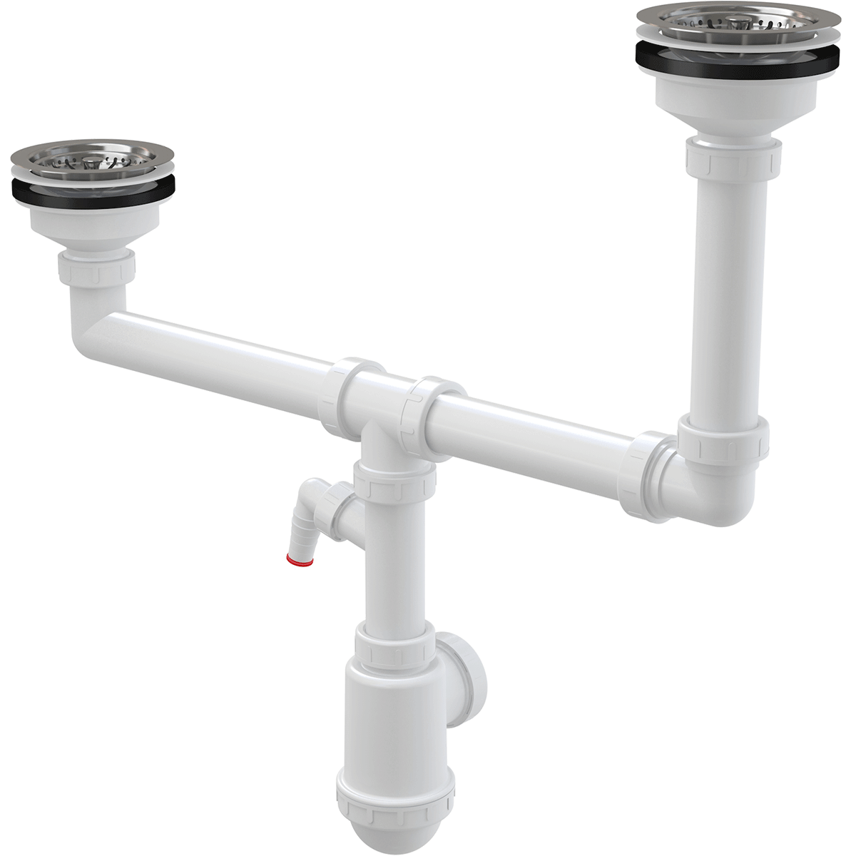 Double sink wastes and trap with stainless steel grids DN115 and connector, two-level