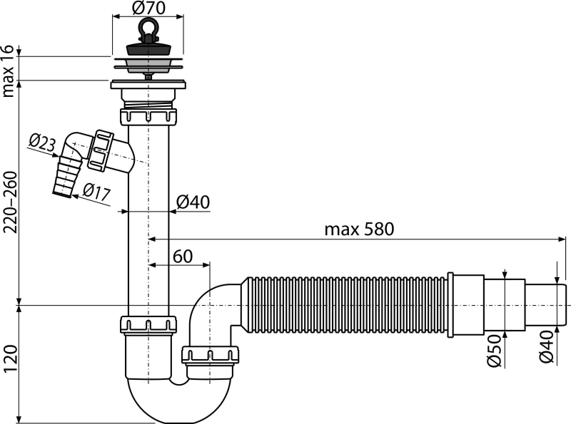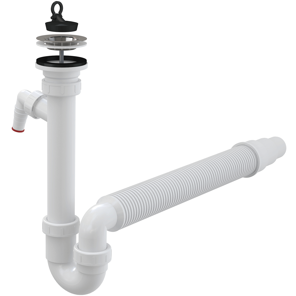 Sink waste and pipe trap with stainless steel grid DN70, connector and flexi pipe