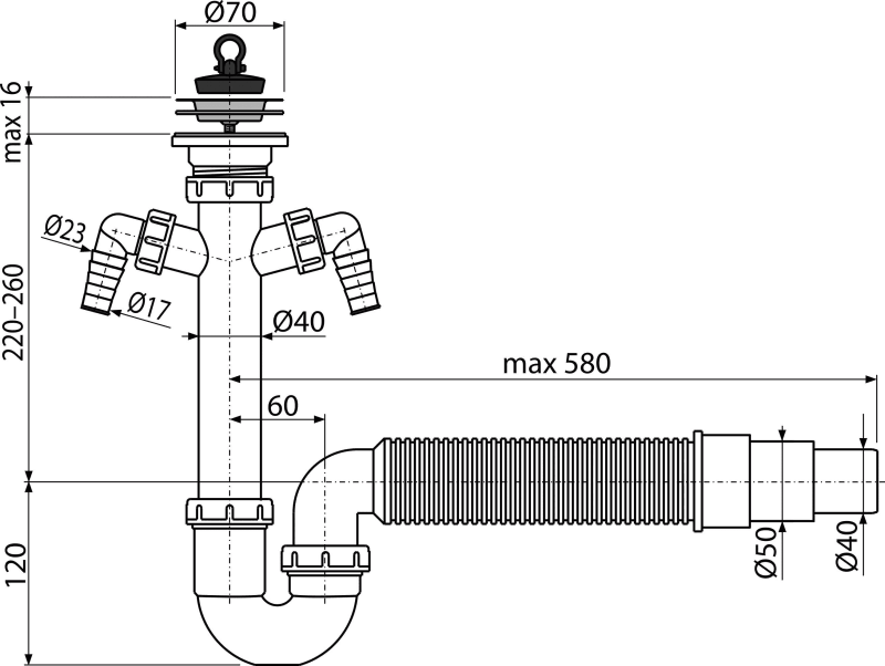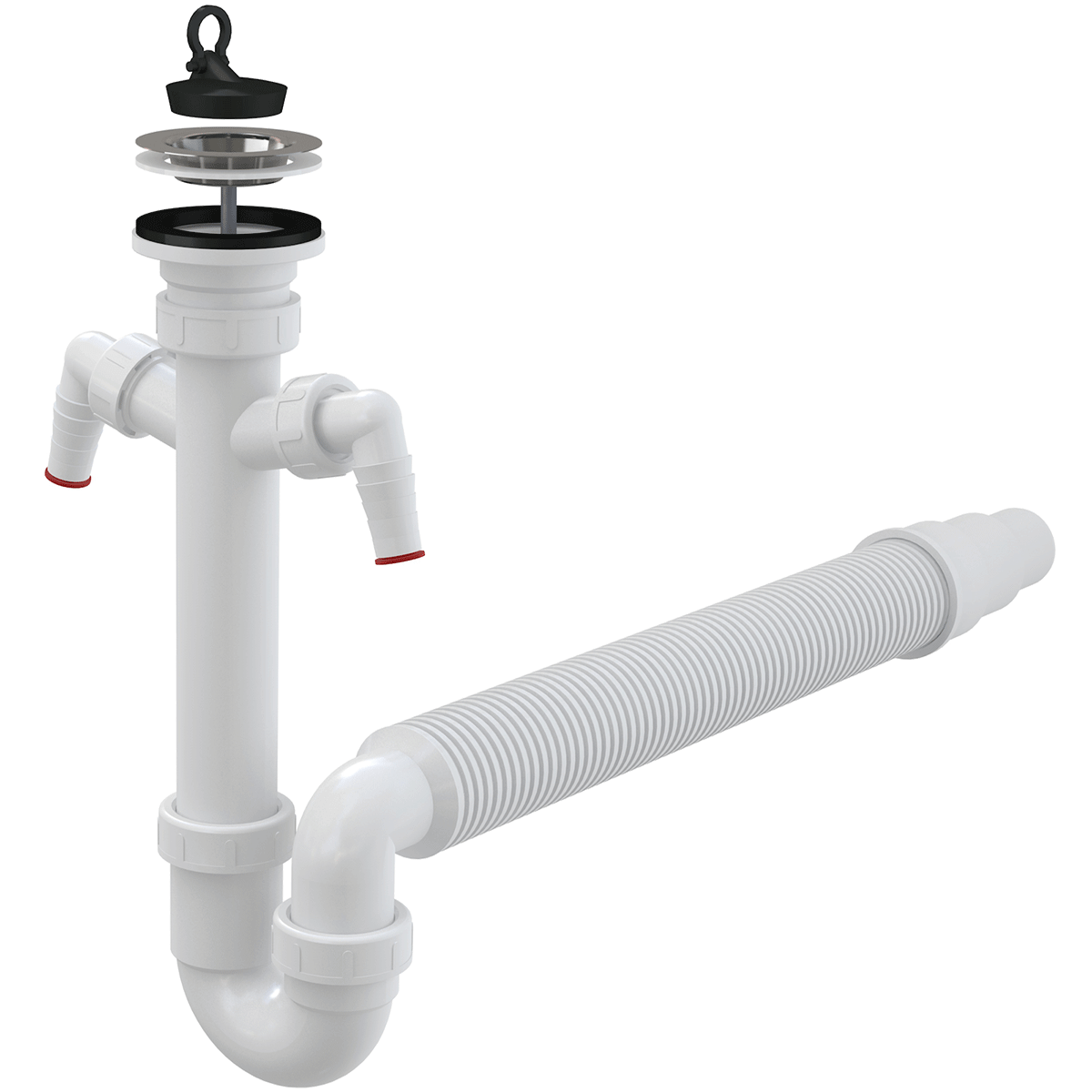 Sink waste and pipe trap with stainless steel grid DN70, two connectors and flexi pipe